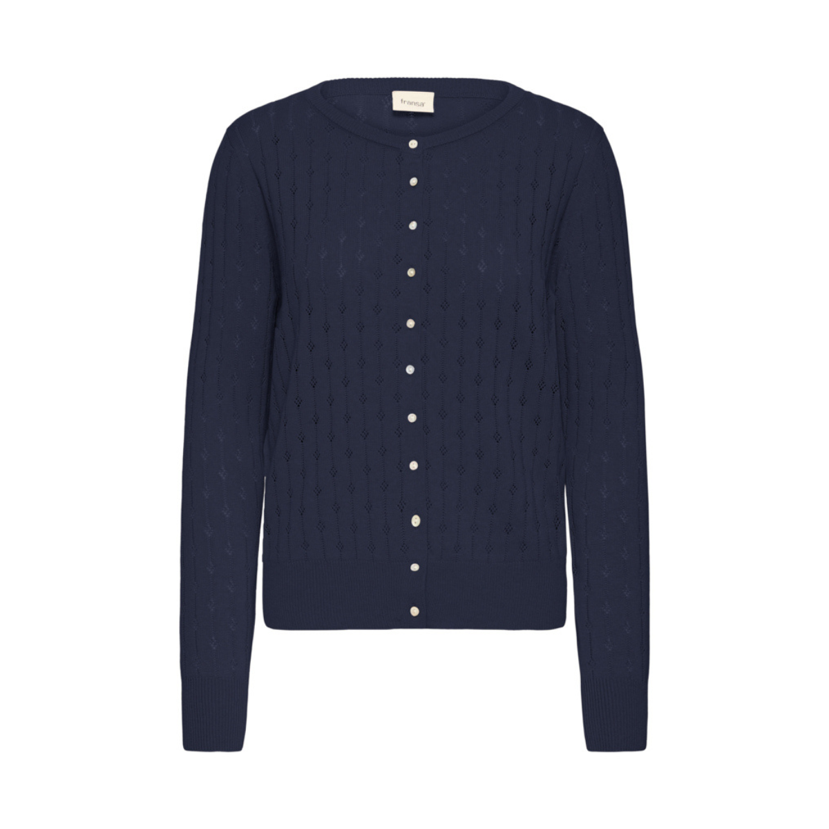 Sød cardigan fra Fransa der er gennemknappet, har lange ærmer samt et hulmønster fordelt på hele cardigan.