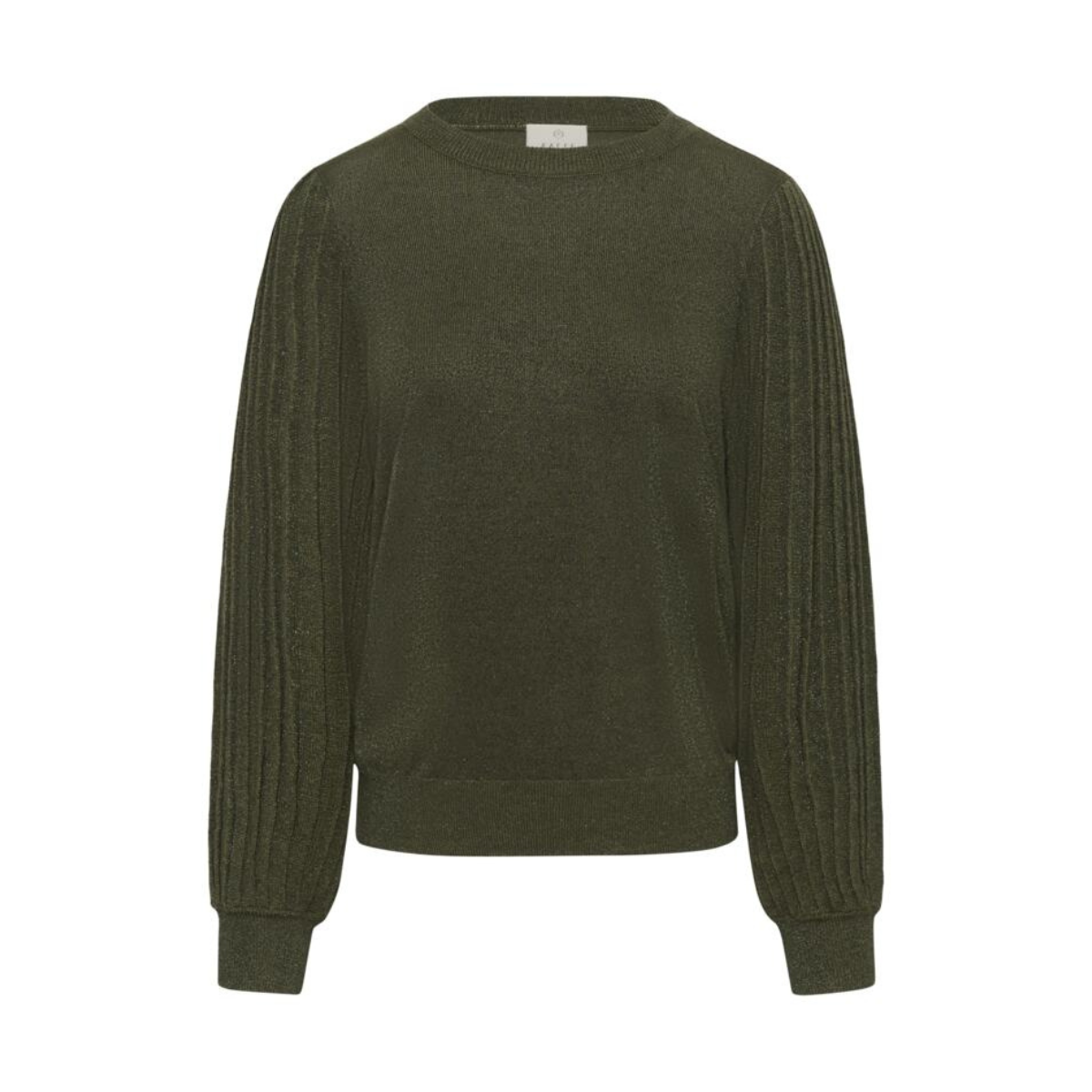 Fin strik fra Kaffe. Strikken har ballonærmer med et tætsiddende stykke for enden og en masse glimmer. Materiale: 70% Viskose. 20% Nylon. 10% Metallic. Vaskeanvisning: Vaskes ved 30 grader.