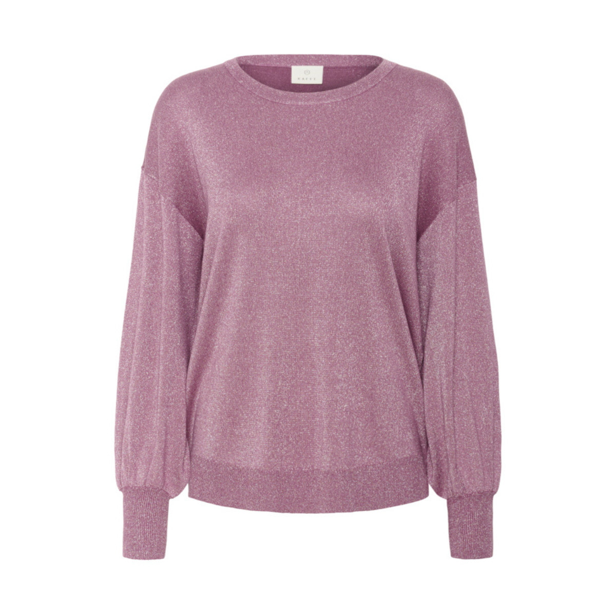 Fin strik fra Kaffe. Strikken har ballonærmer med et tætsiddende stykke for enden og en masse glimmer. Materiale: 70% Viskose. 20% Nylon. 10% Metallic. Vaskeanvisning: Vaskes ved 30 grader.