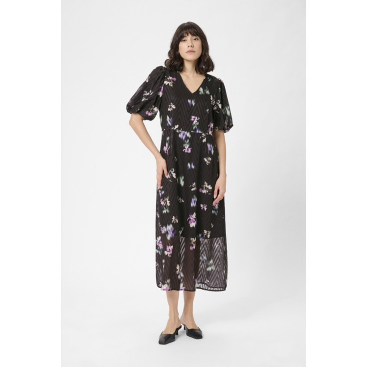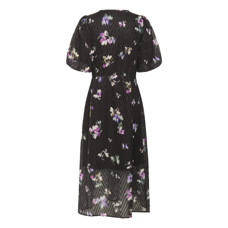 Skøn lang kjole fra Kaffe. Kjolen har V-udskæring, korte pufærmer samt et fint mønster.