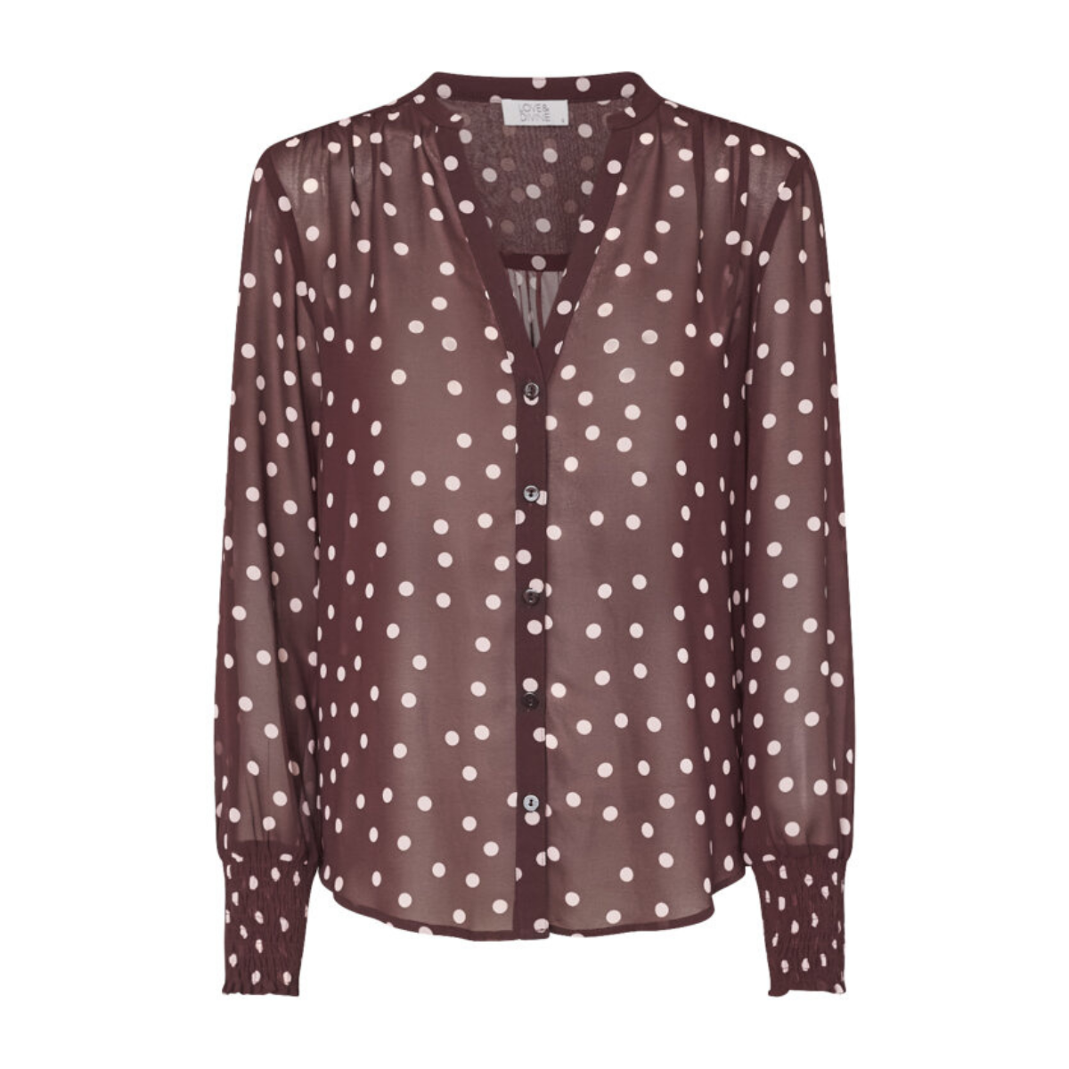 Skøn skjorte fra Love & Divine. Skjorten er i en gennemsigtig kvalitet med lyse prikker, har V-udskæring og lange ærmer med smock forenden.