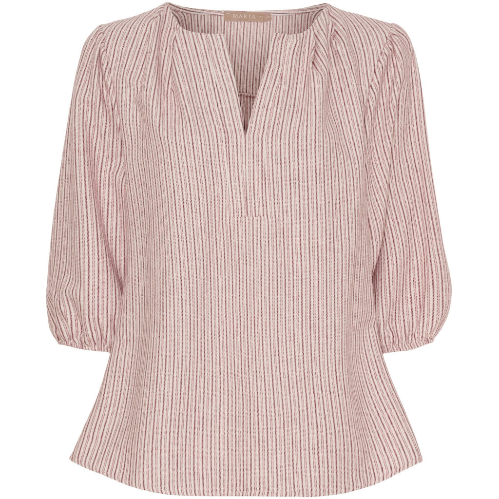 Elegant og feminin bluse fra Marta. Blusen har en rund halsudskæring med en diskret V-udskæring og 3/4 ærmer med elastik. Materiale: 78% Bomuld. 22% Polyester. Vaskeanvisning: Vaskes ved 30 grader.
