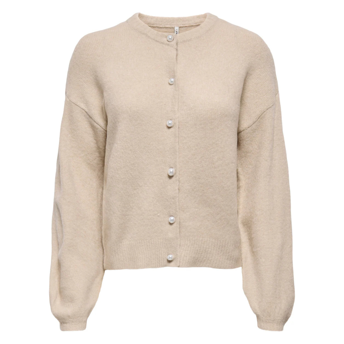 Blød og lækker cardigan med fine hvide perle-knapper, fra Only. Den har ballonærmer og ribkantsdetaljer i alle udskæringer.